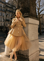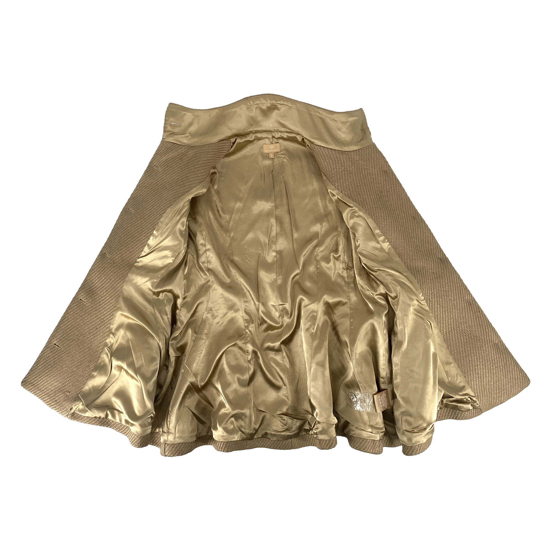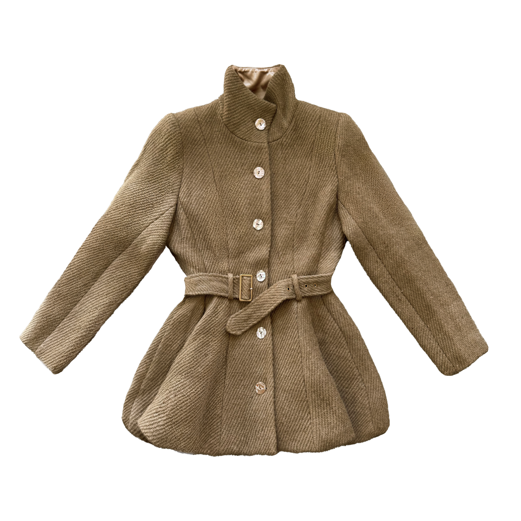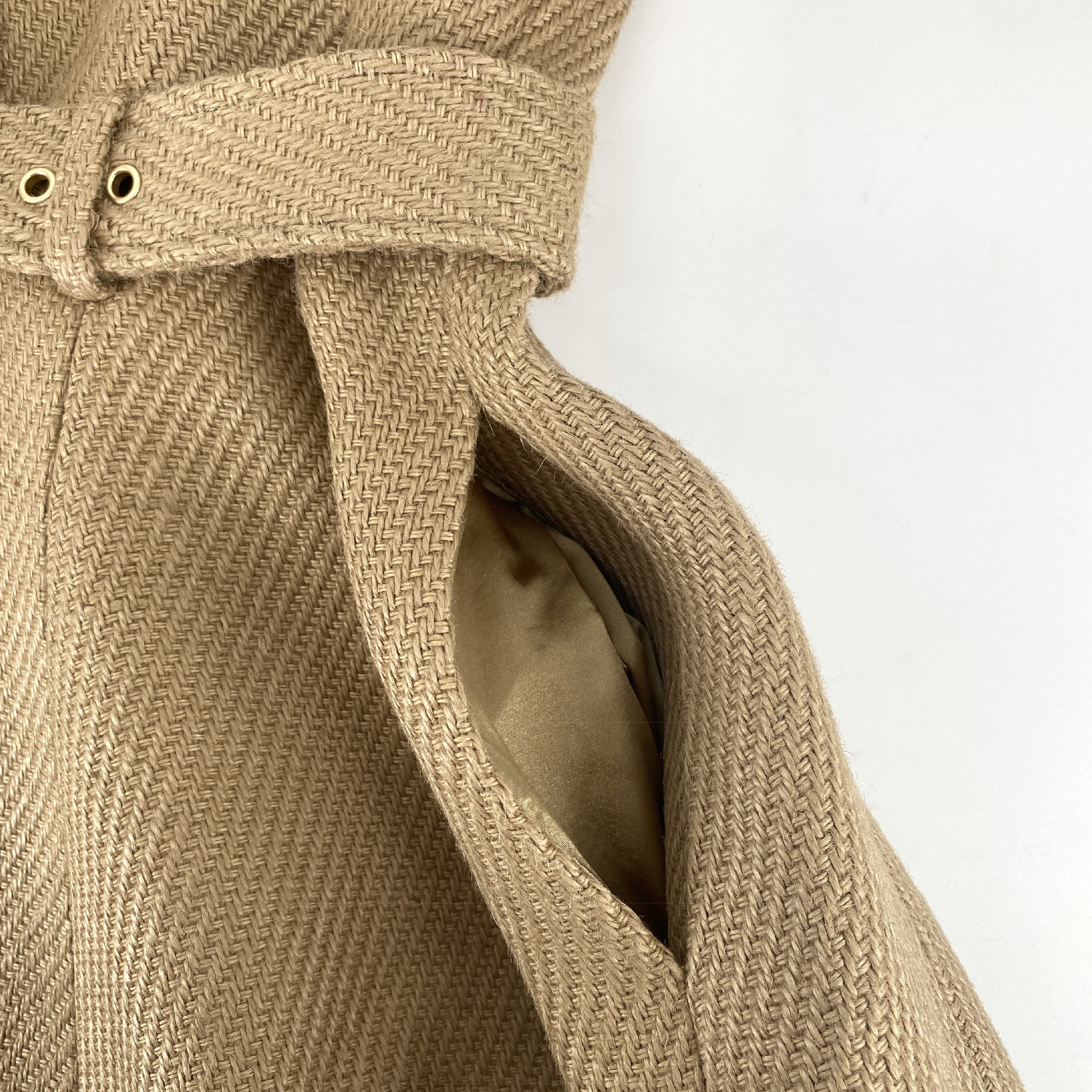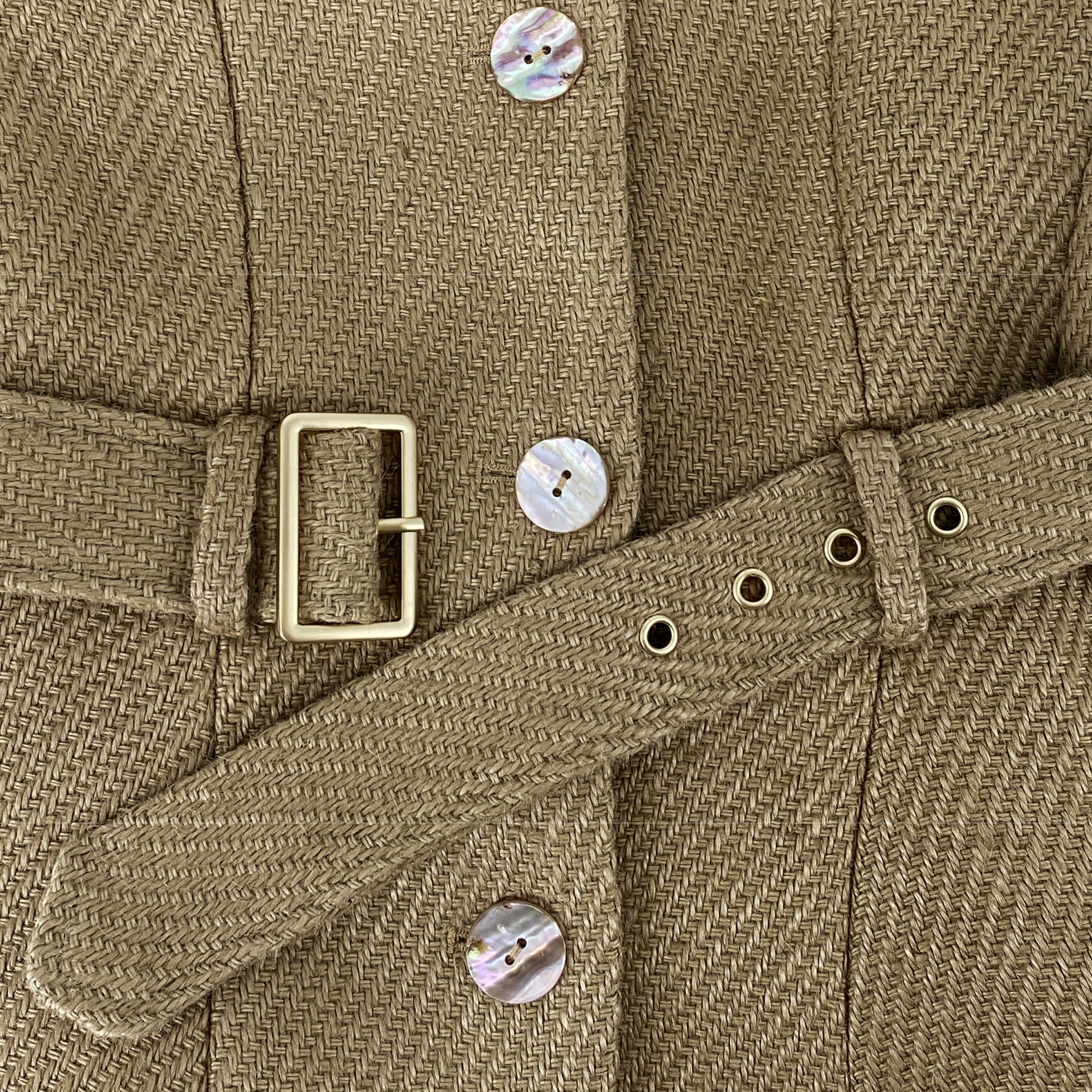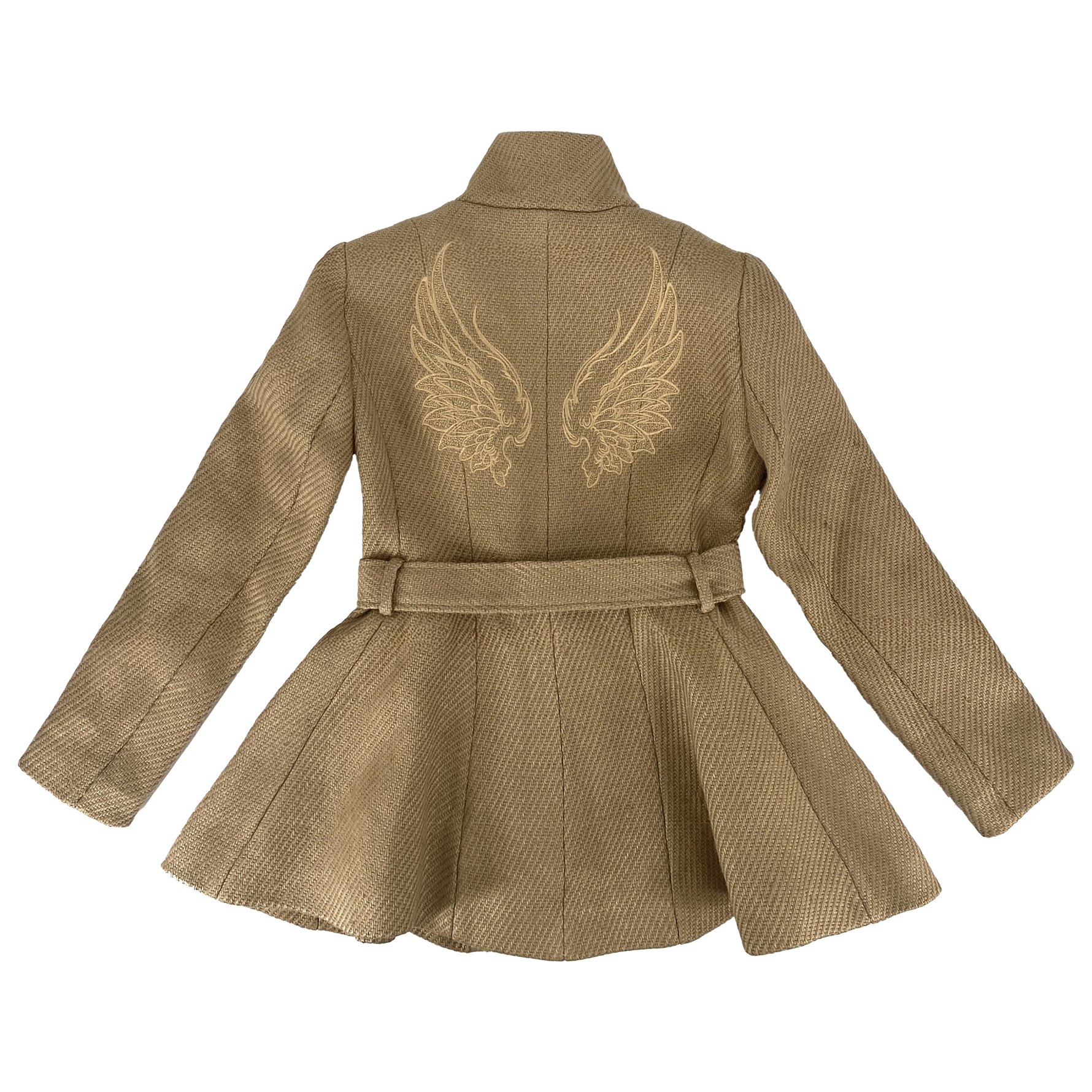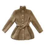Crafted from the same distinctive jute used in Max’s Grounds for Change collection, this edition is left completely undyed, allowing the fiber’s warm latte tone to remain exactly as it appears in nature. The coat features a sculpted, belted waist and signature peplum flare, finished with a smooth satin lining for structure and comfort.