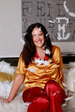 Relax to the Max™ in these super-soft, cozy satin pajamas designed by Max himself, in his favorite colors! Max believes even a night in should be fashionable, elegant, and soft, and these are the ultimate proof. Featuring his hand-drawn logo embroidered over the heart, this set also carries his signature wings across the back, making them a true collector’s piece.